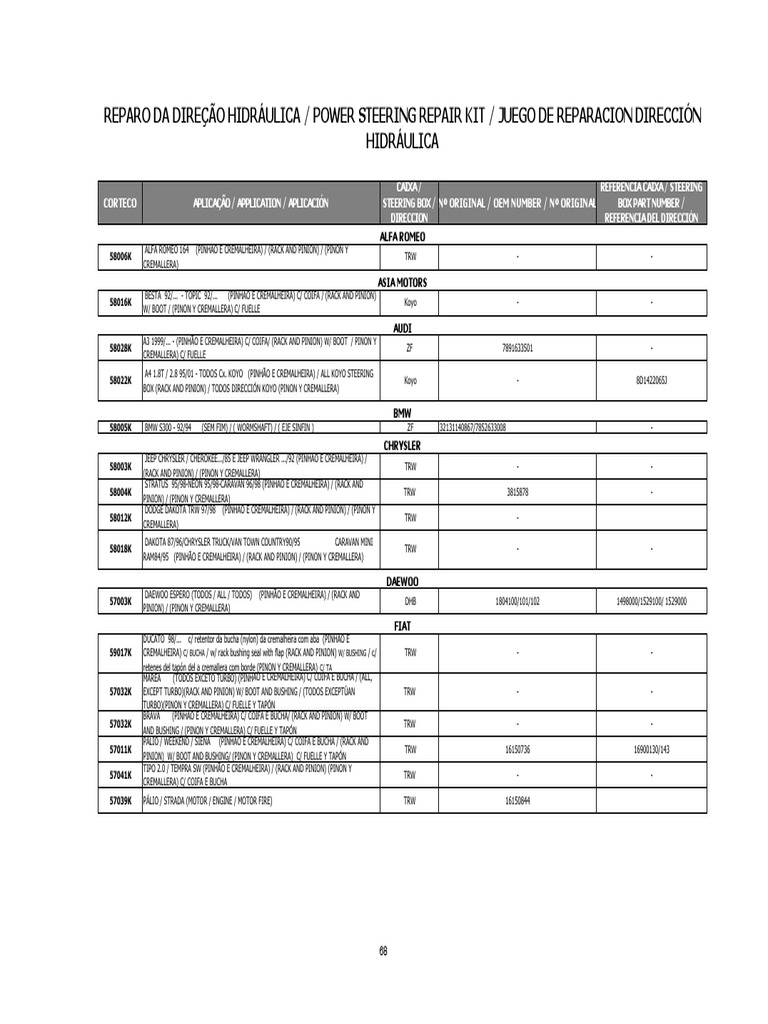 REPARO DA DIREÇÃO HIDRÁULICA / POWER STEERING REPAIR KIT / JUEGO DE REPARACION DIRECCIÓN