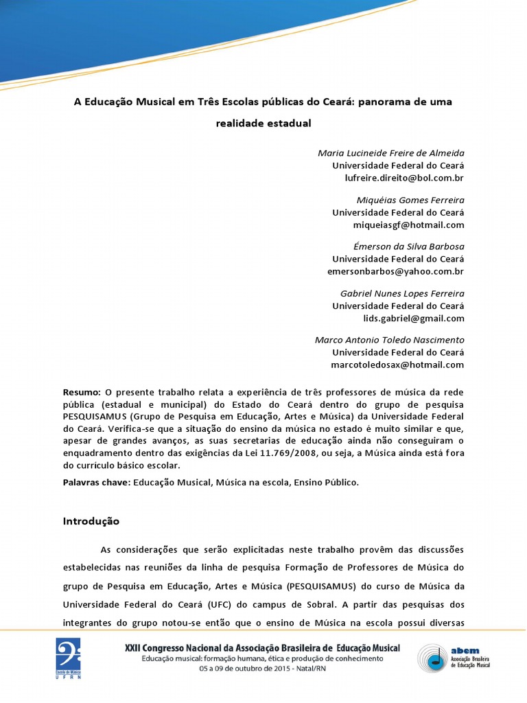 SOUSA, Laiany R. e GUIMARÃES, Francisco das C. R. Perfil e formação do professor de Música: conhecendo um pouco mais este profissional em Sobral-Ceará. 2014. In.: XII