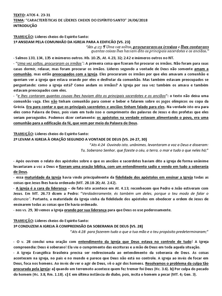 TEMA: “CARACTERÍSTICAS DE LÍDERES CHEIOS DO ESPÍRITO SANTO” 24/06/2018