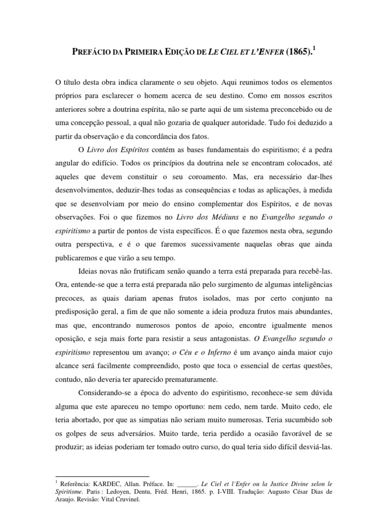 Referência: KARDEC, Allan. Préface. In: ______. Le Ciel et l’Enfer ou la Justice Divine selon le