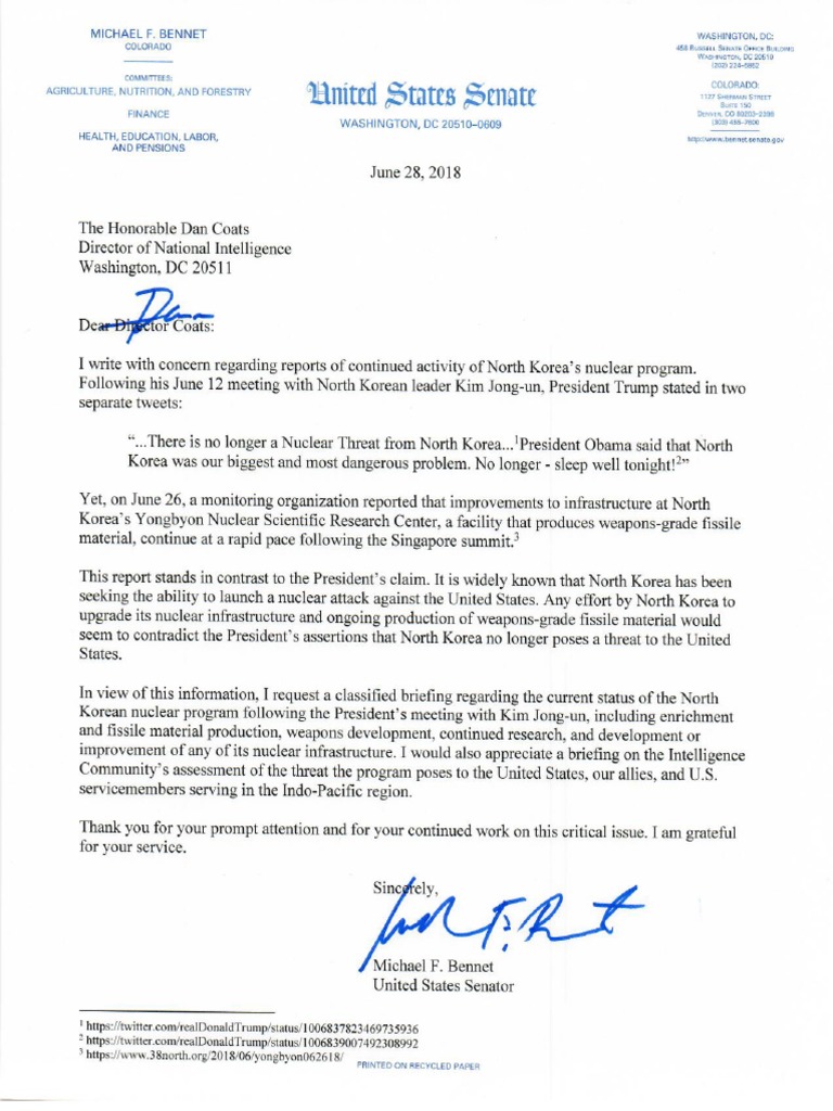 Colorado U.S. Senator Michael Bennet sent a letter to Director of National Intelligence Dan Coats to request an assessment of North Korea’s nuclear program in light of reports of activity, c…Descrição completa