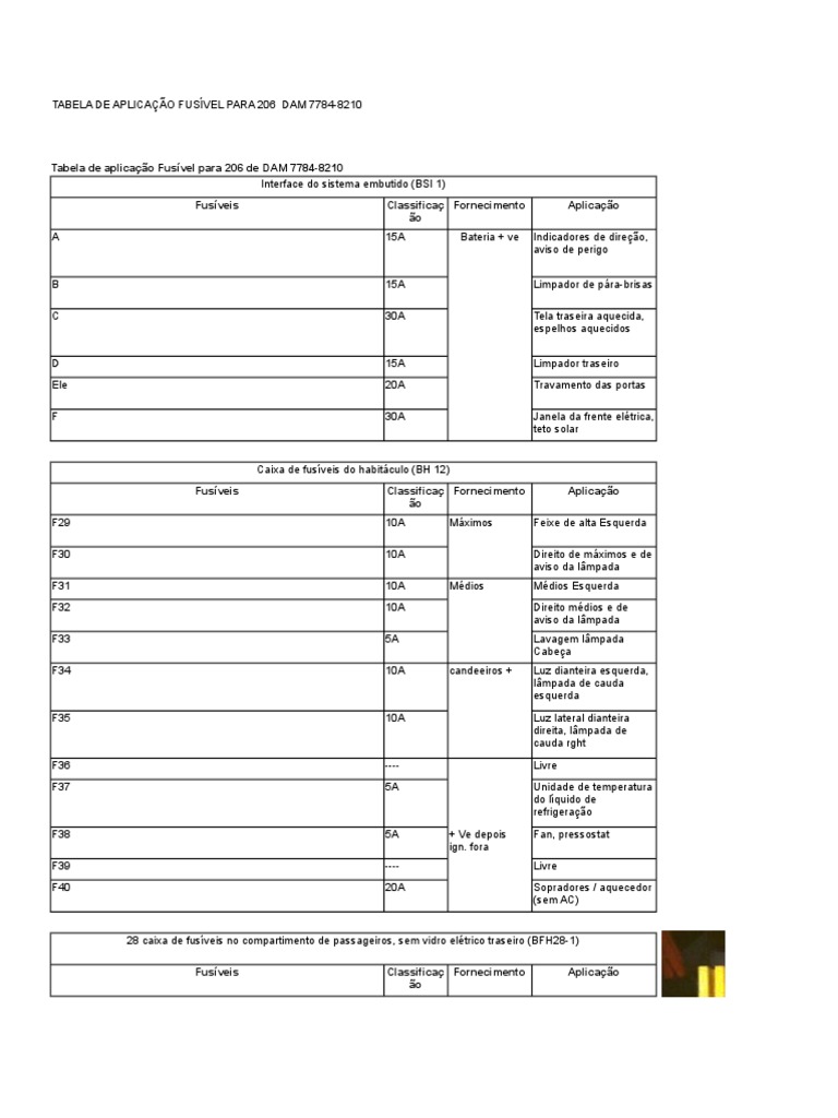 TABELA DE APLICAÇÃO FUSÍVEL PARA 206 DAM 7784-8210