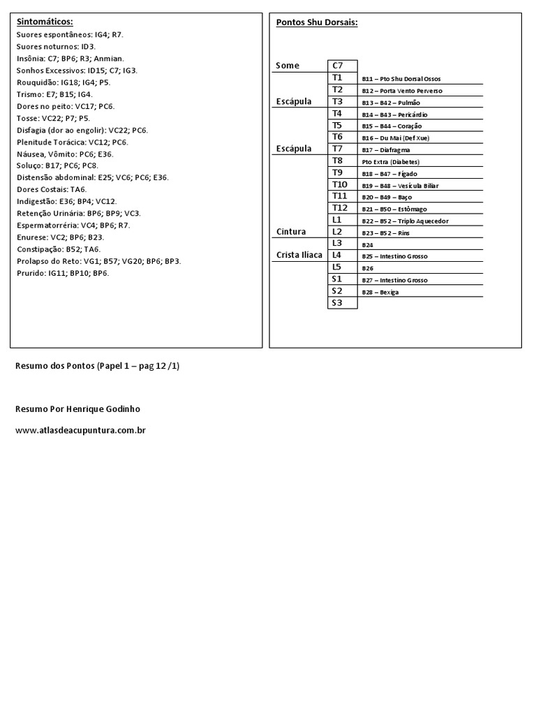 Sintomáticos: Pontos Shu Dorsais: