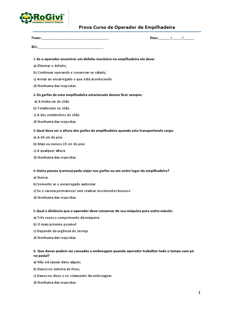 Prova Curso de Operador de Empilhadeira
