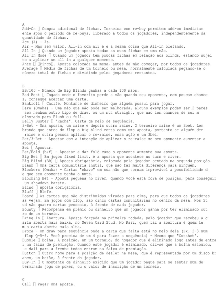 Big Blind (BB) Aposta obrigatória, colocada pelo jogador sentado na segunda posição.