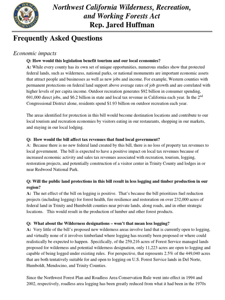 The net effect of the bill on logging is positive. That’s because the bill prioritizes fuel reduction projects (including logging) for forest health, fire resilience and restoration on over 232,000 acres of federal land in Trinity and Humboldt counties near private lands, along roads, and in other strategic locations. This would result in the production of lumber and other forest products.