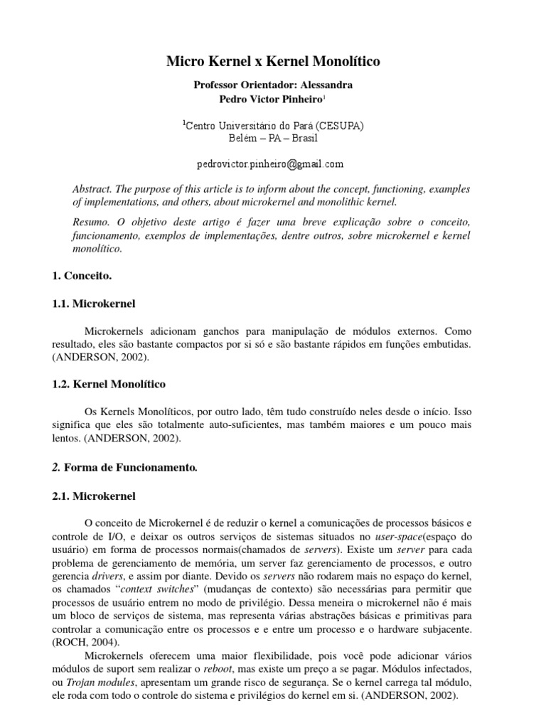 funcionamento, exemplos de implementações, dentre outros, sobre microkernel e kernel