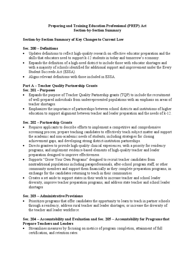 Preparing and Training Education Professional (PREP) Act Section-by-Section Summary Section-by-Section Summary of Key Changes to Current Law Sec. 200 – Definitions