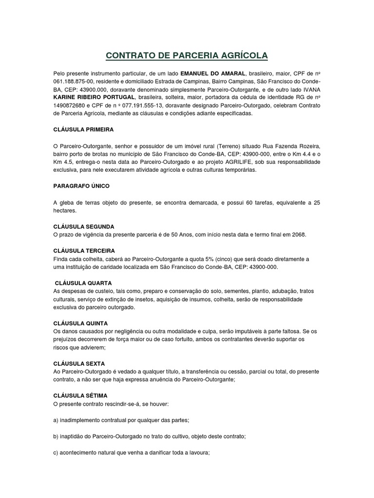O Parceiro-Outorgante, senhor e possuidor de um imóvel rural (Terreno) situado Rua Fazenda Rozeira,