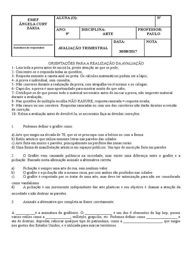 ( ) Trata-se de apenas de um grafite sobre uma superfície plana sem qualquer preocupação artística.