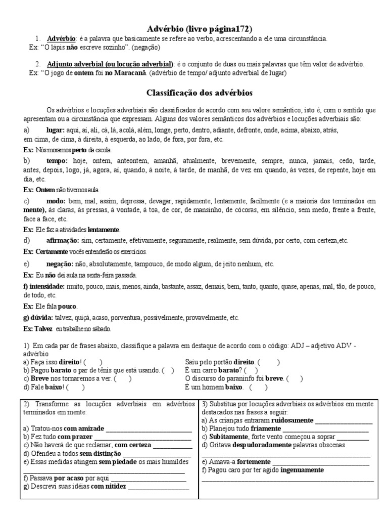 2) Transforme as locuções adverbiais em advérbios 3) Substitua por locuções adverbiais os advérbios em mente