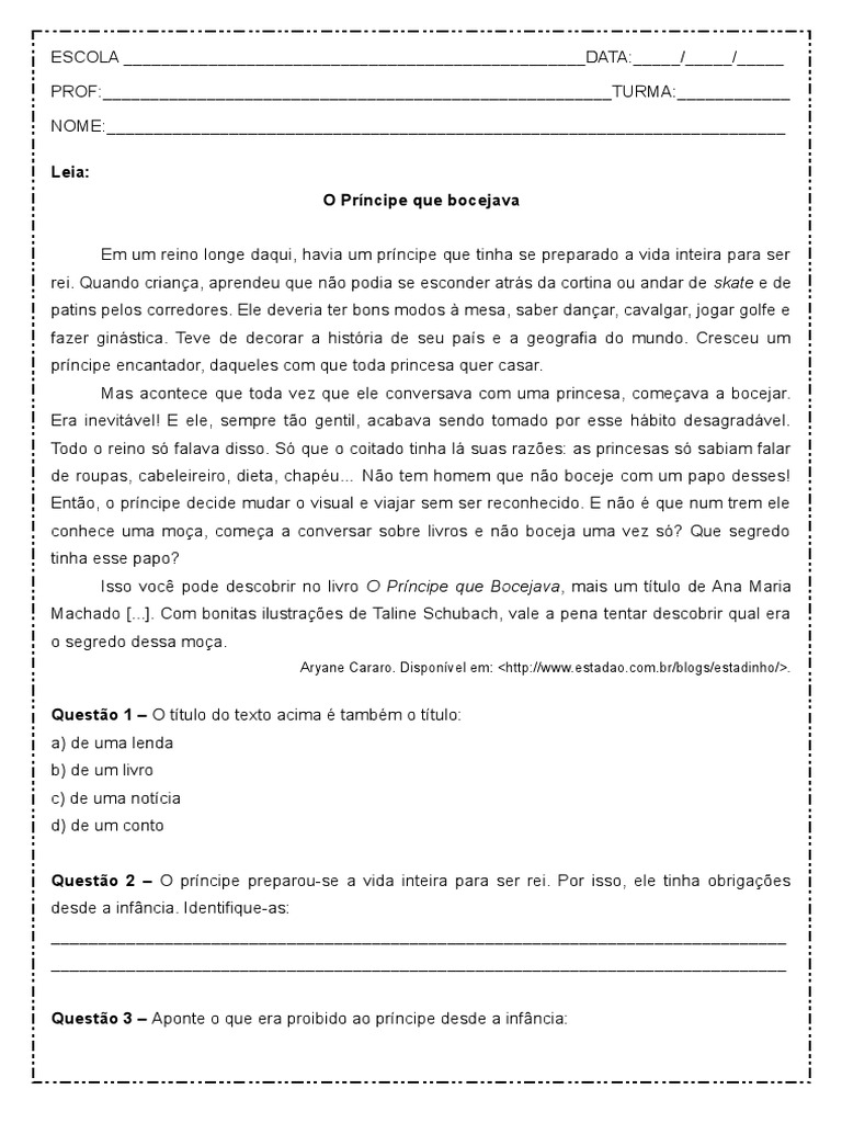 Questão 7 – Na passagem “Isso você pode descobrir no livro O Príncipe que Bocejava [...]”, o