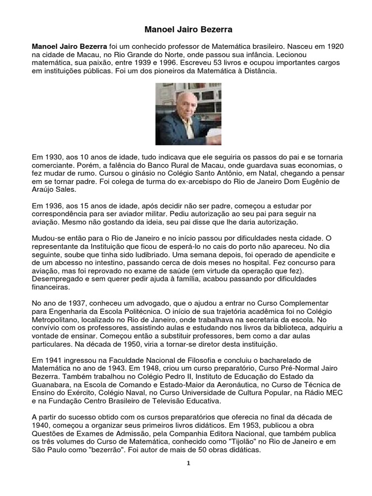 Manoel Jairo Bezerra foi um conhecido professor de Matemática brasileiro. Nasceu em 1920