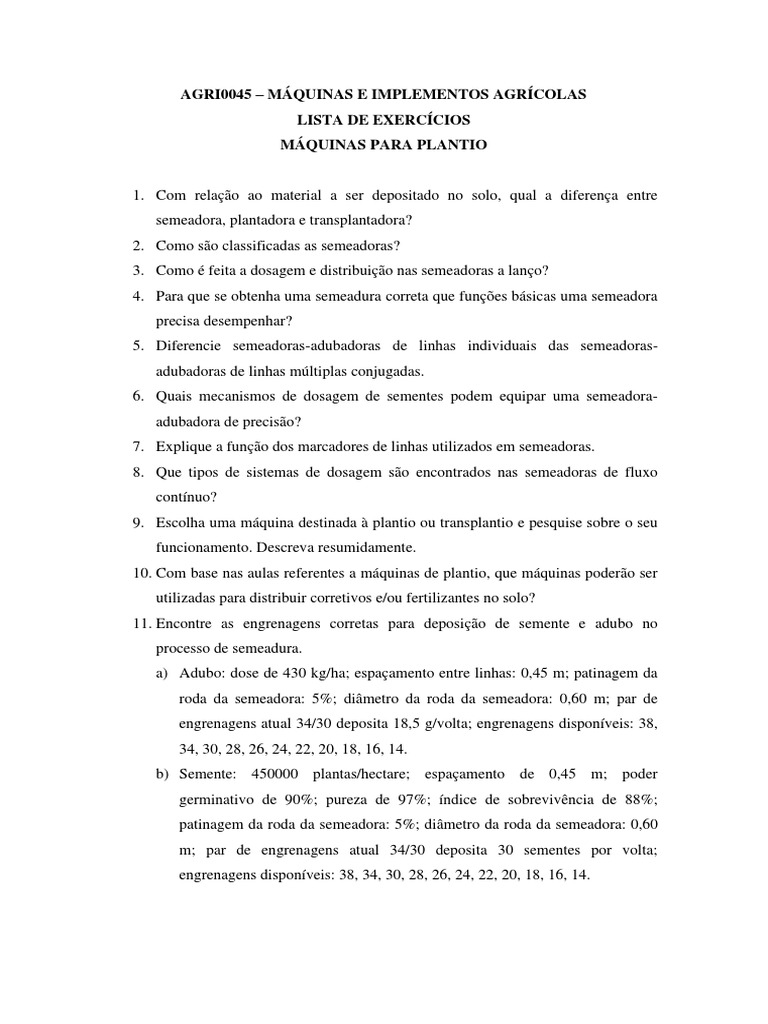 10. Com base nas aulas referentes a máquinas de plantio, que máquinas poderão ser