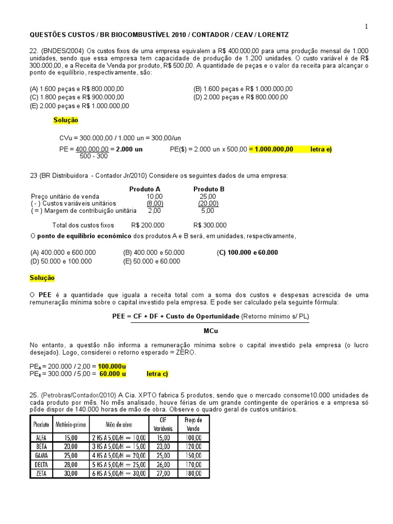 QUESTÕES CUSTOS / BR BIOCOMBUSTÍVEL 2010 / CONTADOR / CEAV / LORENTZ