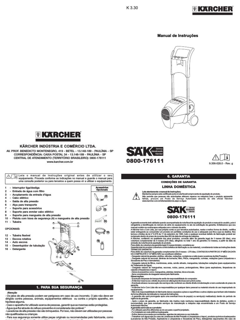 1. PARA SUA SEGURANÇA - A Kärcher Ind e Com Ltda não se responsabiliza por qualquer dano pessoal ou material oriundo do uso inapropriado do