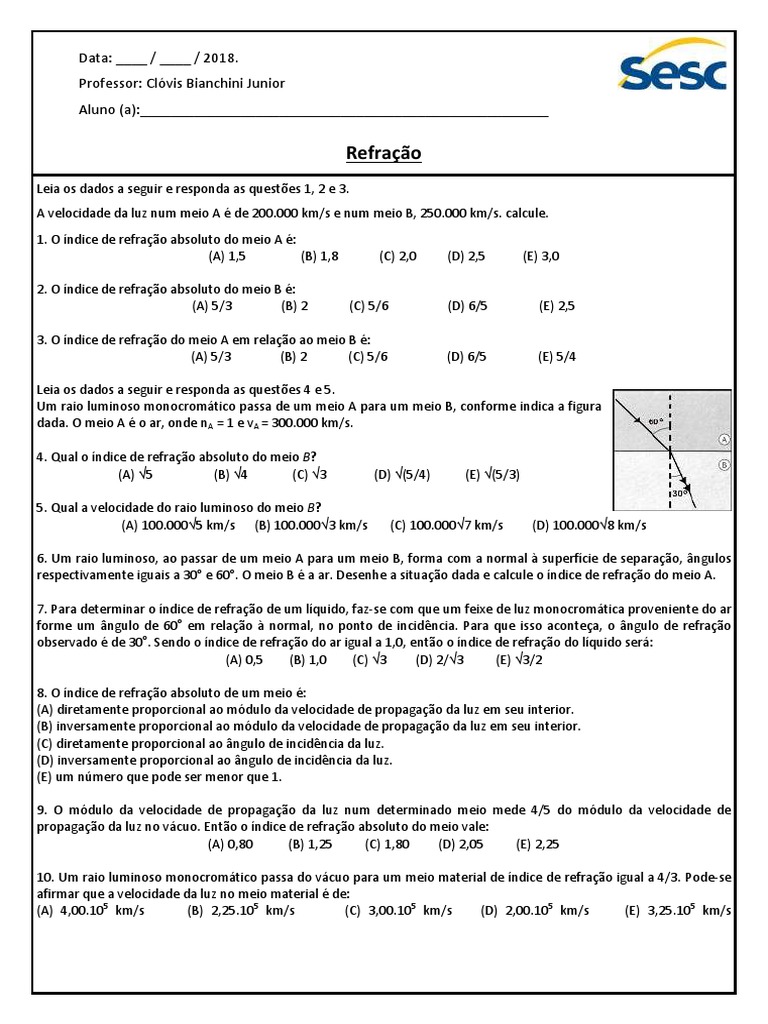 A velocidade da luz num meio A é de 200.000 km/s e num meio B, 250.000 km/s. calcule.
