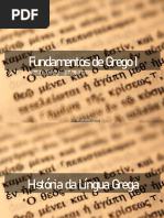 1. O documento discute a história da língua grega desde seus primórdios por volta de 1500 a.C. até os dias atuais. 2. É dividido em períodos que vão desde a formação inicial até o grego moderno, passando pelo clássico, koinê e bizantino. 3. Também aborda o aticismo, um movimento literário que buscava utilizar formas arcaicas do dialeto ático.