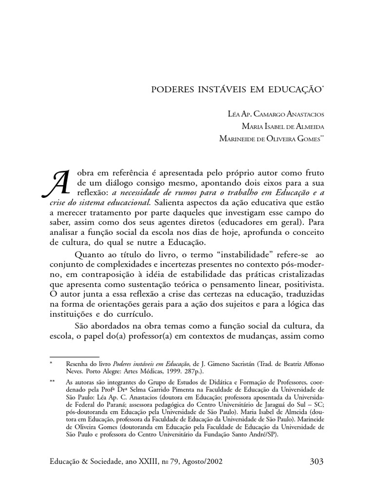 * Resenha do livro Poderes instáveis em Educação, de J. Gimeno Sacristán (Trad. de Beatriz Affonso