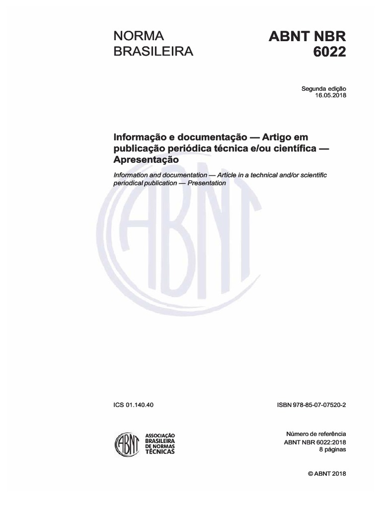iv © ABNT 2018 . são elaboradas por Comissões de Estudo (CE). de 14 de maio de 1996). AABNT NBR 6022 foi elaborada no Comitê Brasileiro de Inf rmação e Documentação (ABNT/CB-014). a qual f i tecnica mente revisada O Escopo em inglês desta Norma Brasileira é o seguinte: Scope This Standard species general principes r pparation and presentation of elements th at constitute acles in a technical an/or scientific periodical pubcation. os Órgãos responsáveis pelos Regulamentos Técnicos podem determinar outras datas para exigência dos requisitos desta Norma. de 25102016 a 02012017 O seu 2 Proeto de Revisão º ° circulou em Consulta Nacional conforme Edital n 11. f rmadas pelas partes interessadas no tema objeto da normalização Os Documentos Técnicos ABNT são elaborados conf rme as regras da ABNT Diretiva 2 AABNT chama a atenção para que. dos Organismos de Normalização Setorial (ABNT/ONS) e das Comissões de Estudo Especiais (ABNT/CEE).odos os direitos reseados reseados .279. º Ressalta-se que Normas Brasileiras podem ser objeto de citação em Regulamentos Técnicos Nestes casos. apesar apesa r de ter sido solicitada manifestação sobre eventuais direitos de patentes durante a Consulta Nacional. de 01112017 a 01122017 º Esta segunda edição cancela e substitui a edição anterior (ABNT NBR 60222003). cujo conteúdo é de responsabilidade dos Comitês Brasileiros (ABNT/CB).ABNT NBR 6022:2018 Prefácio A Associação Brasileira de Normas Técnicas (ABNT) é o Foro Nacional de Normalização. As Normas Brasileiras. estes podem ocorrer e devem ser comunicados à ABNT a qualquer momento (Lei n 9. pela Comissão de Estudo de Documentação (CE014:000001) O seu 1 Projeto de Revisã ° Revisãoo circulou em Consulta Nacional conf rme Edital n 1.
