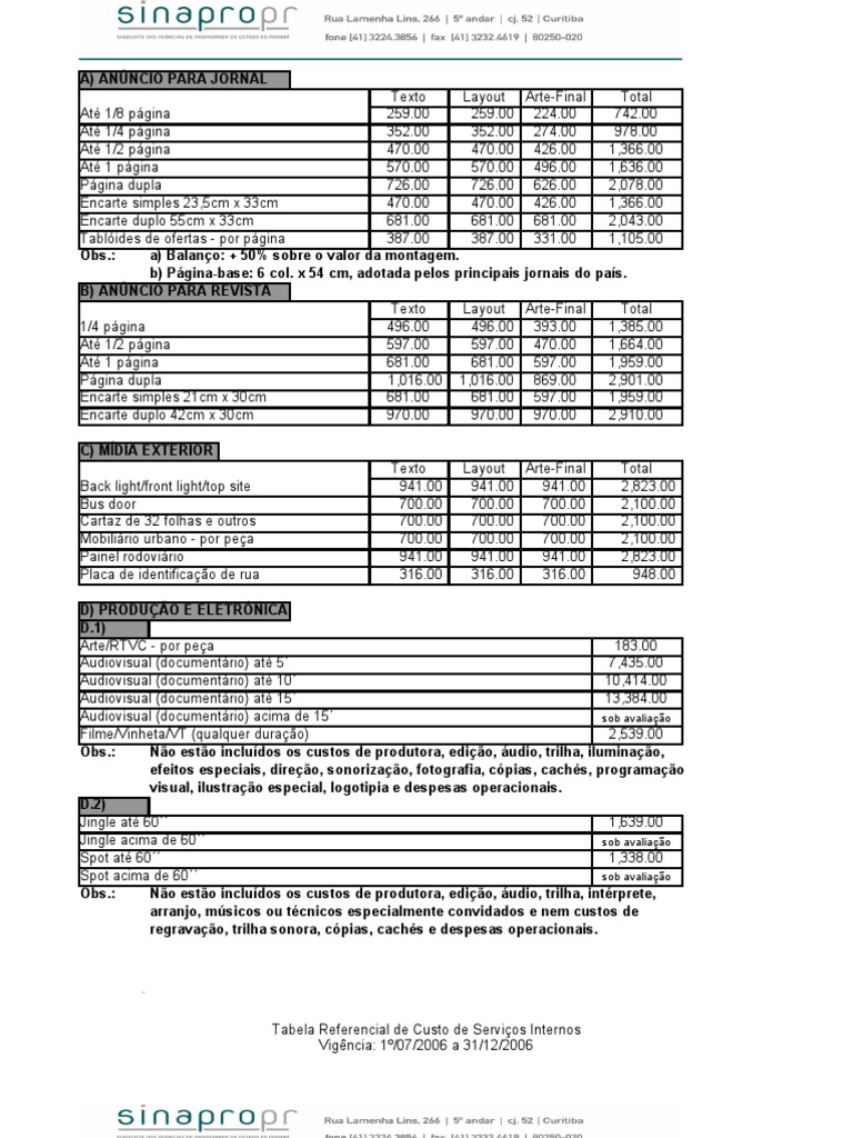 Obs.: Não estão incluídos os custos de produtora, edição, áudio, trilha, intérprete,