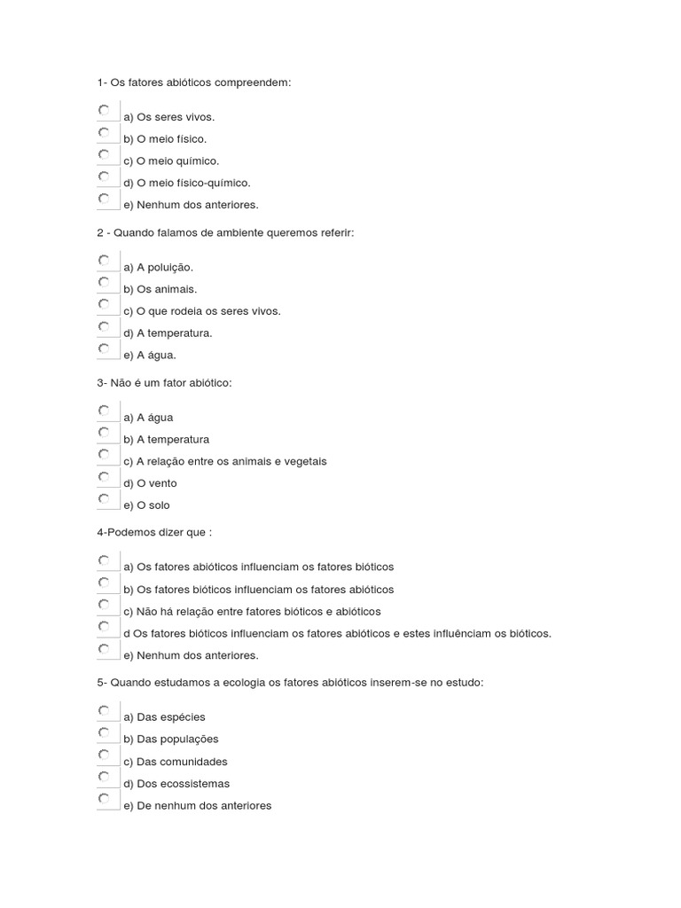 5- Quando estudamos a ecologia os fatores abióticos inserem-se no estudo: