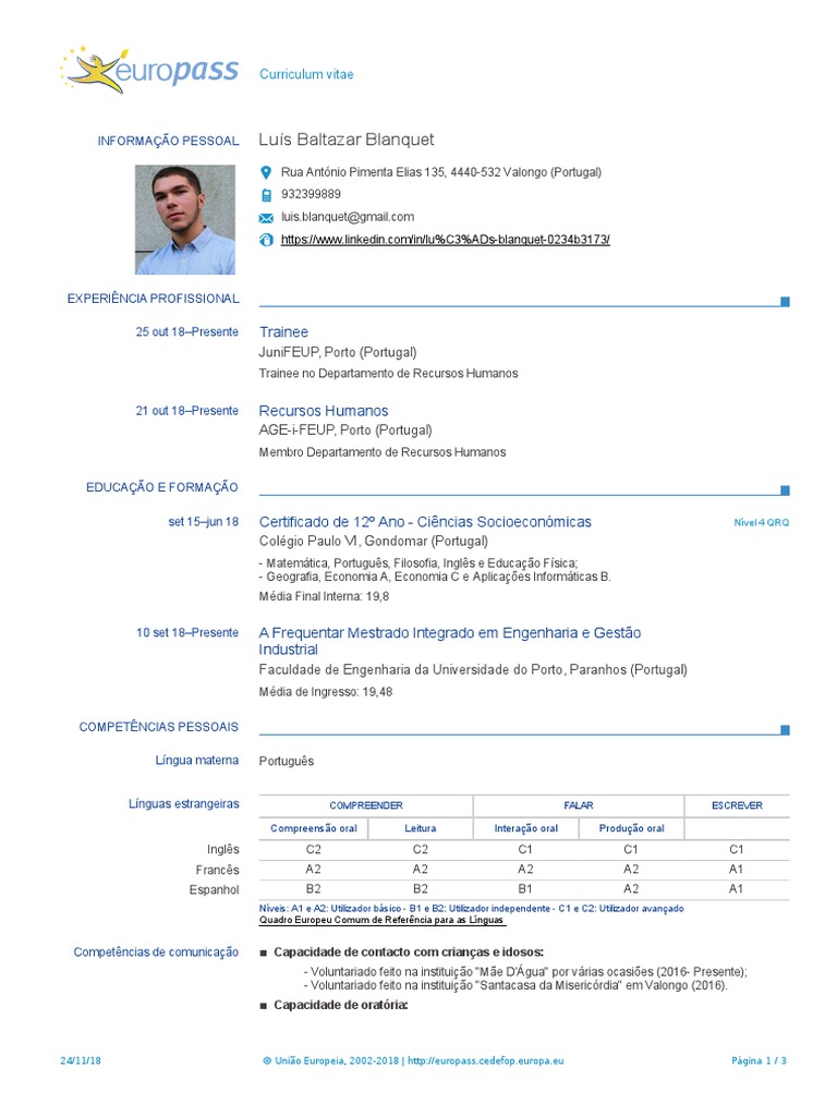 24/11/18 © União Europeia, 2002-2018 | http://europass.cedefop.europa.eu Página 1 / 3