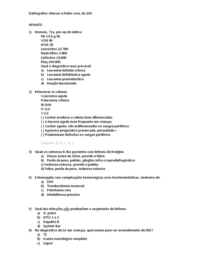 20b, 21d, 22ª, 23d, 24c, 25d, 26a, 27d, 28d, 29c, 30b, 31c, 32c, 33b, 34a, 35d, 36b, 37 Linfoma