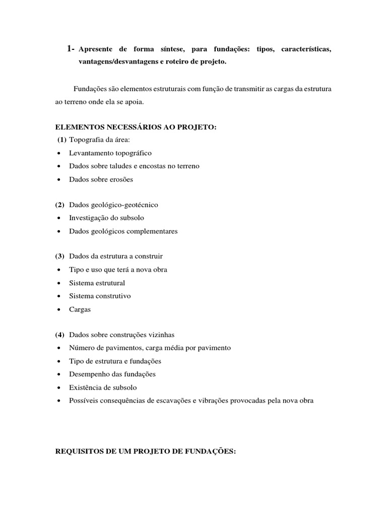 1- Apresente de forma síntese, para fundações: tipos, características,