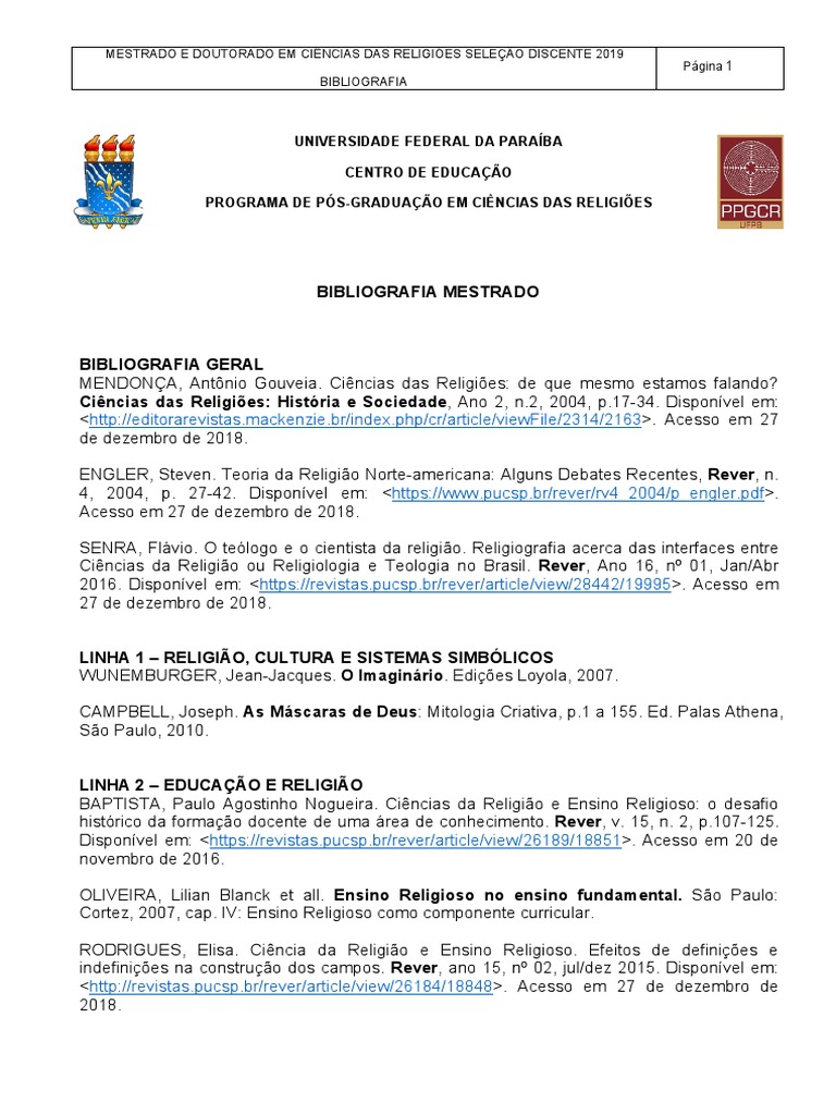 MESTRADO E DOUTORADO EM CIÊNCIAS DAS RELIGIÕES SELEÇÃO DISCENTE 2019