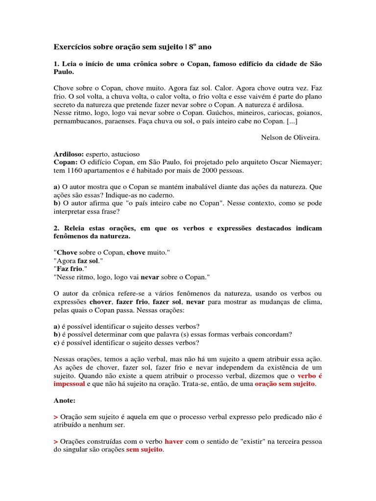 Exercícios sobre oração sem sujeito | 8º ano