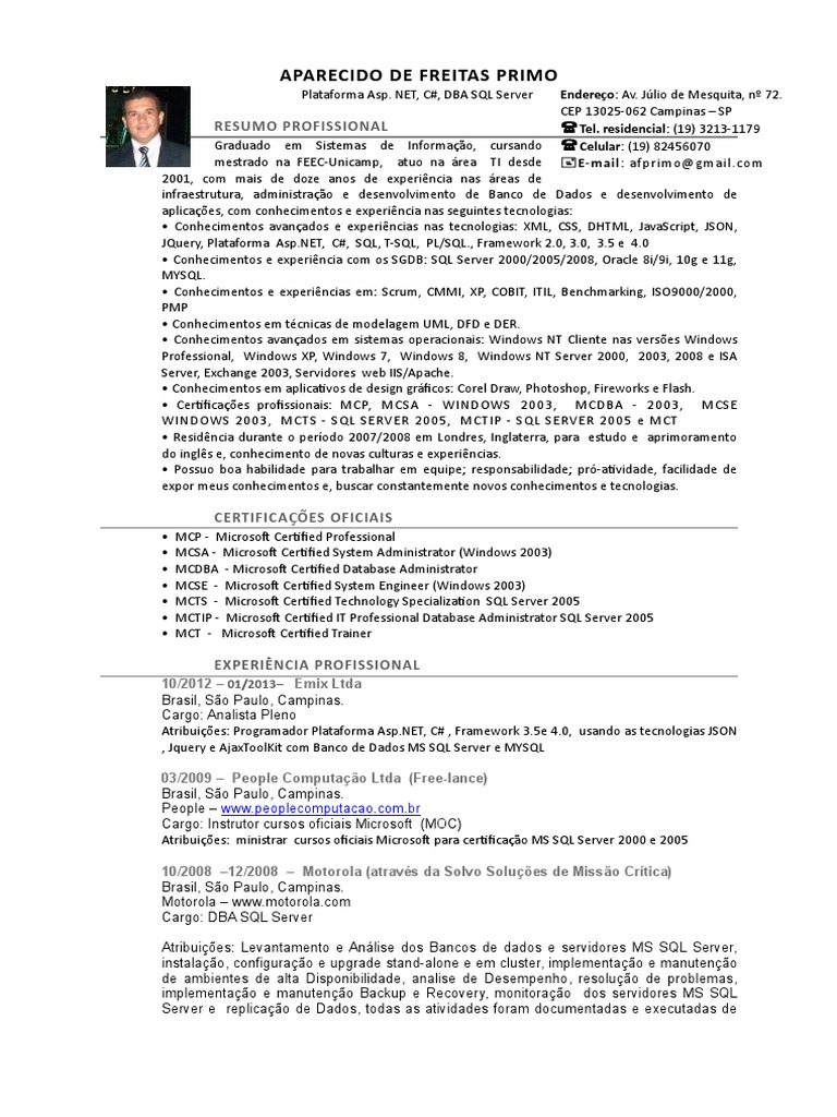 • Certificações profissionais: MCP, MCSA - WINDOWS 2003, MCDBA - 2003, MCSE