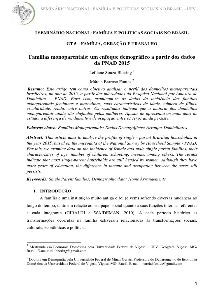 Abstract: This article aims to analyze the profile of single - parent Brazilian households, in
