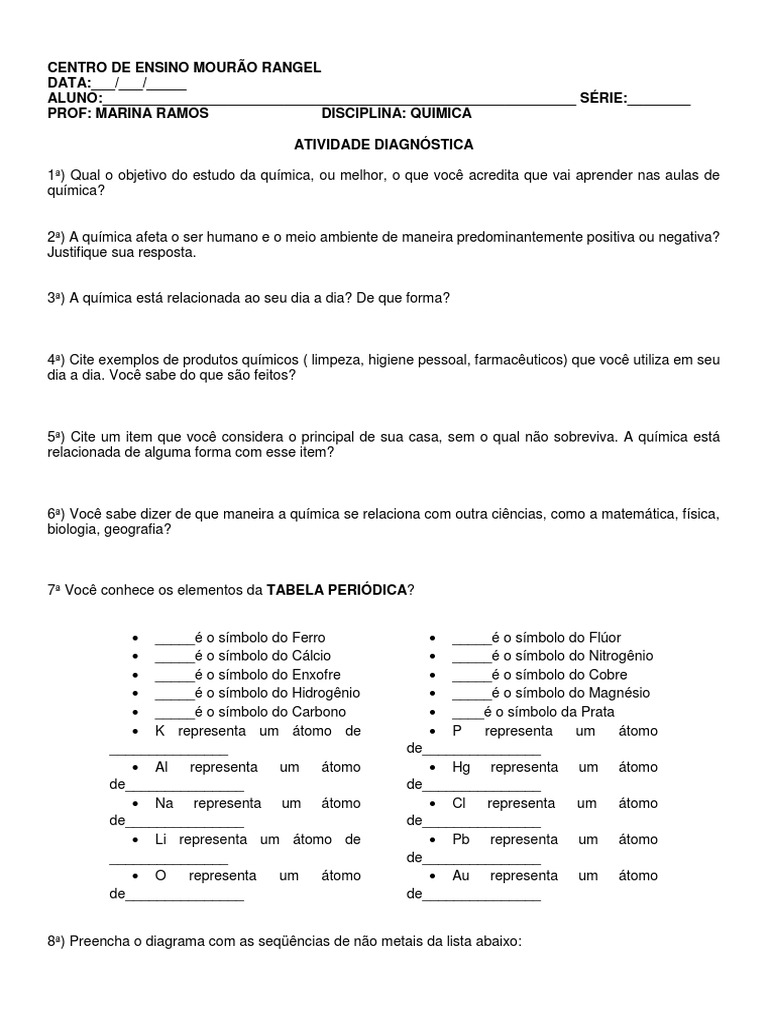 1ª) Qual o objetivo do estudo da química, ou melhor, o que você acredita que vai aprender nas aulas de