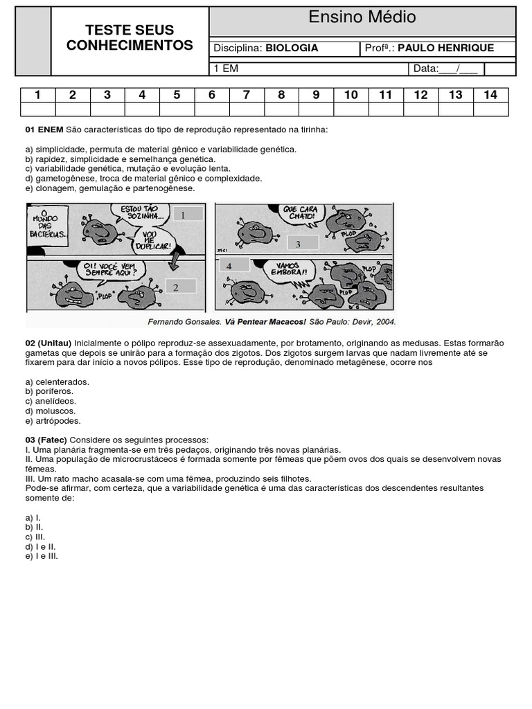 01 ENEM São características do tipo de reprodução representado na tirinha: