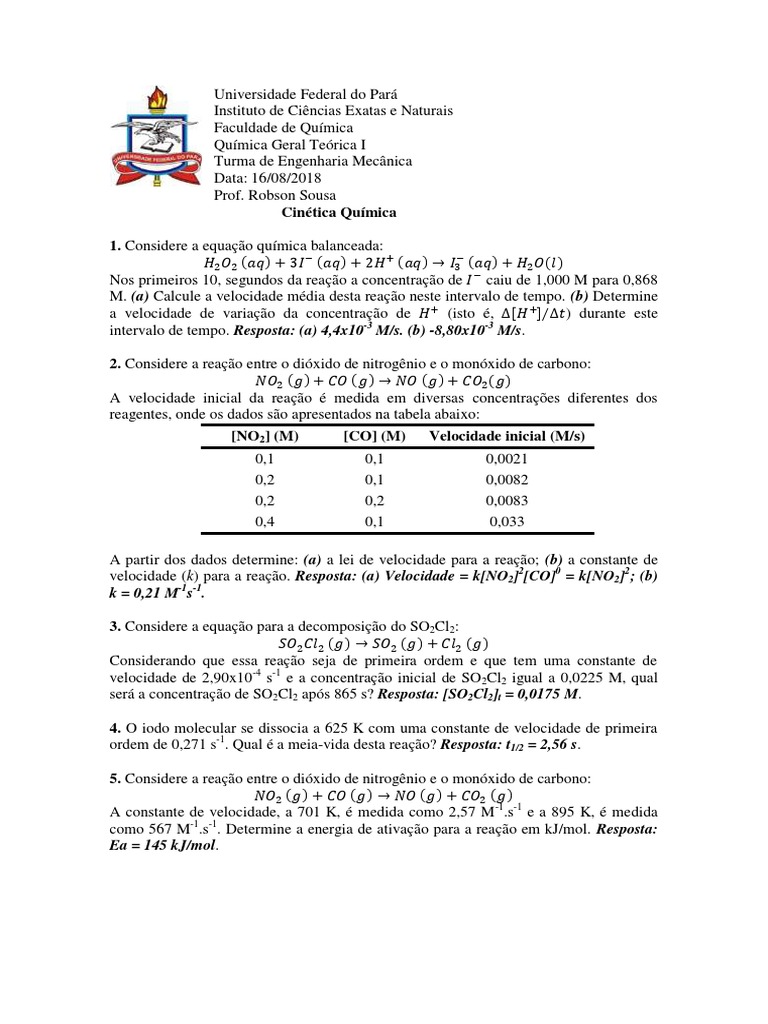velocidade da reação, em unidades do SI. Resposta: (a) 2; (b) 25.