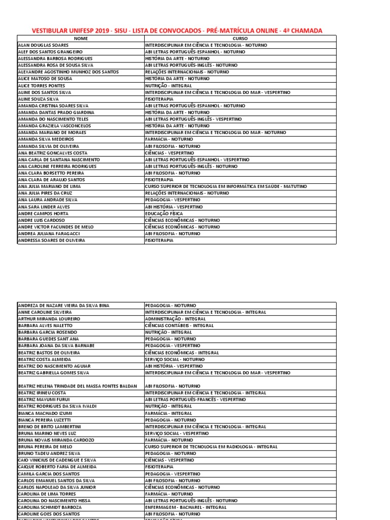 VESTIBULAR UNIFESP 2019 - SISU - LISTA DE CONVOCADOS - PRÉ-MATRÍCULA ONLINE - 4ª CHAMADA