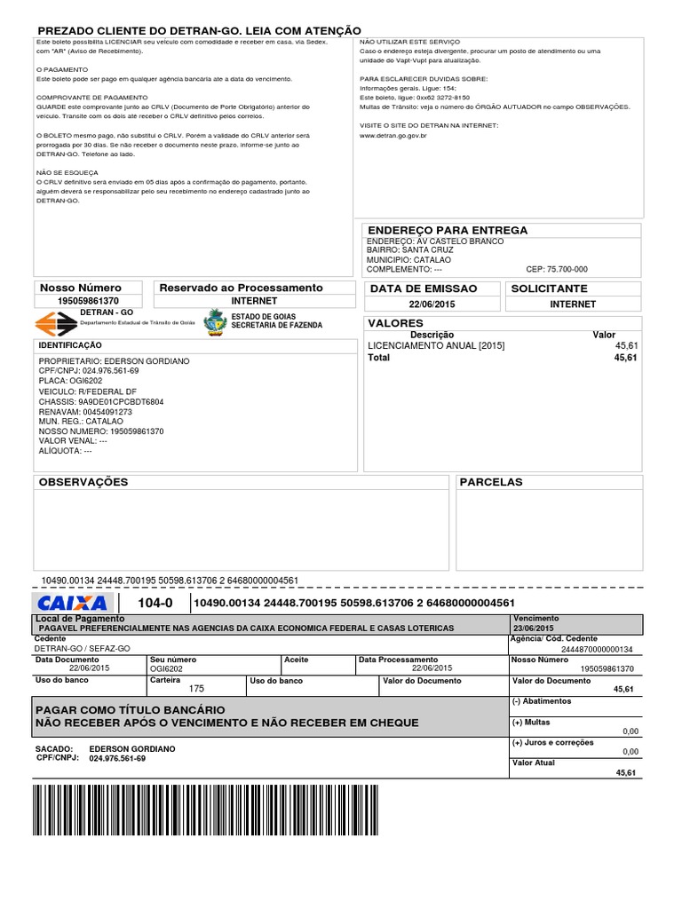 Este boleto possibilita LICENCIAR seu veÍculo com comodidade e receber em casa, via Sedex, NÃO UTILIZAR ESTE SERVIÇO
