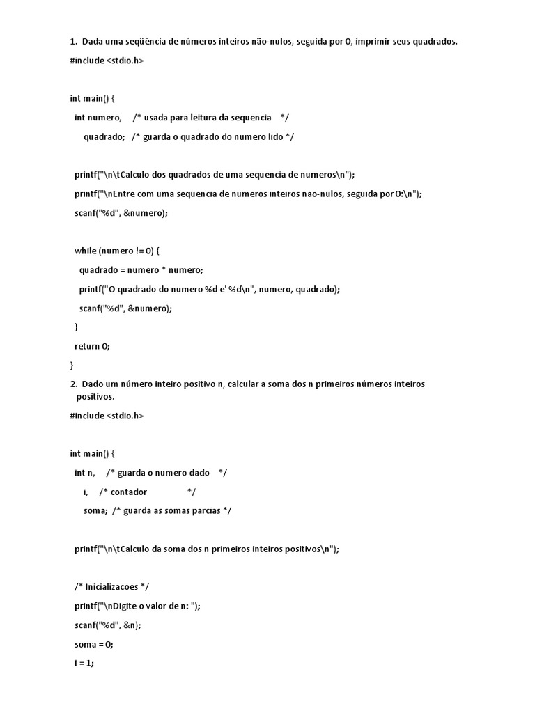 1. Dada uma seqüência de números inteiros não-nulos, seguida por 0, imprimir seus quadrados.
