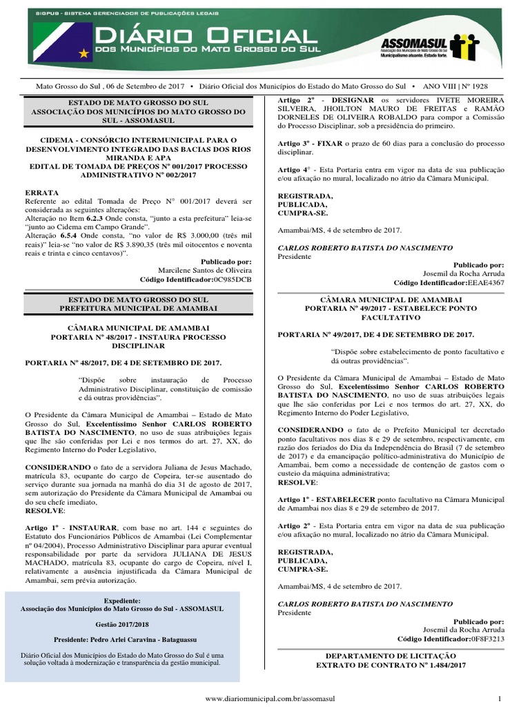 Mato Grosso do Sul , 06 de Setembro de 2017 • Diário Oficial dos Municípios do Estado do Mato Grosso do Sul • ANO VIII | Nº 1928