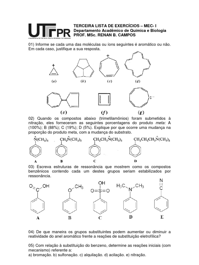 01) Informe se cada uma das moléculas ou íons seguintes é aromático ou não.