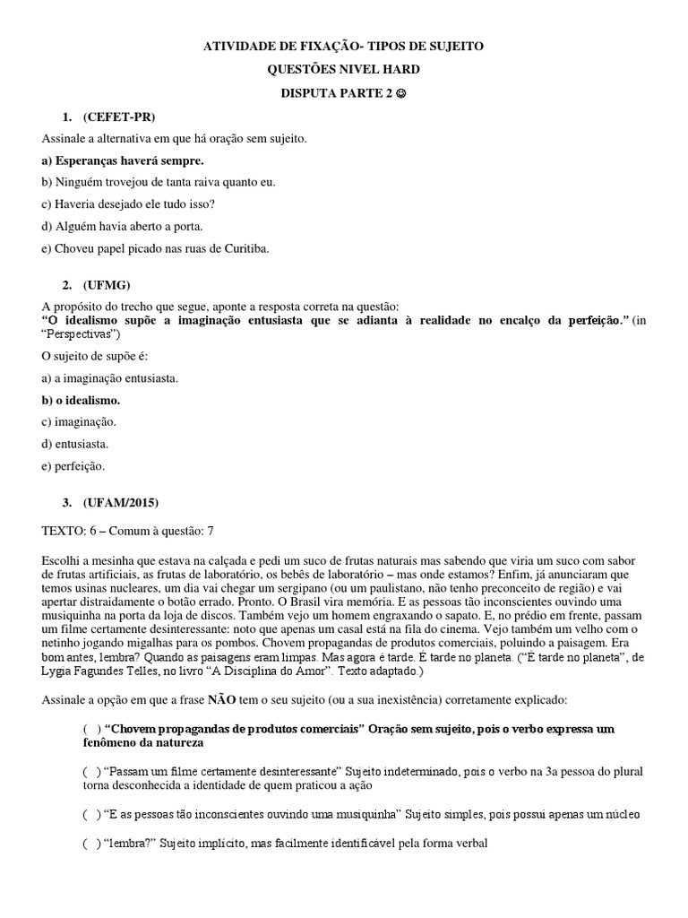 ATIVIDADE DE FIXAÇÃO- TIPOS DE SUJEITO