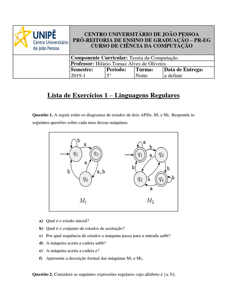 Questão 1. A seguir estão os diagramas de estados de dois AFDs, M1 e M2. Responda às