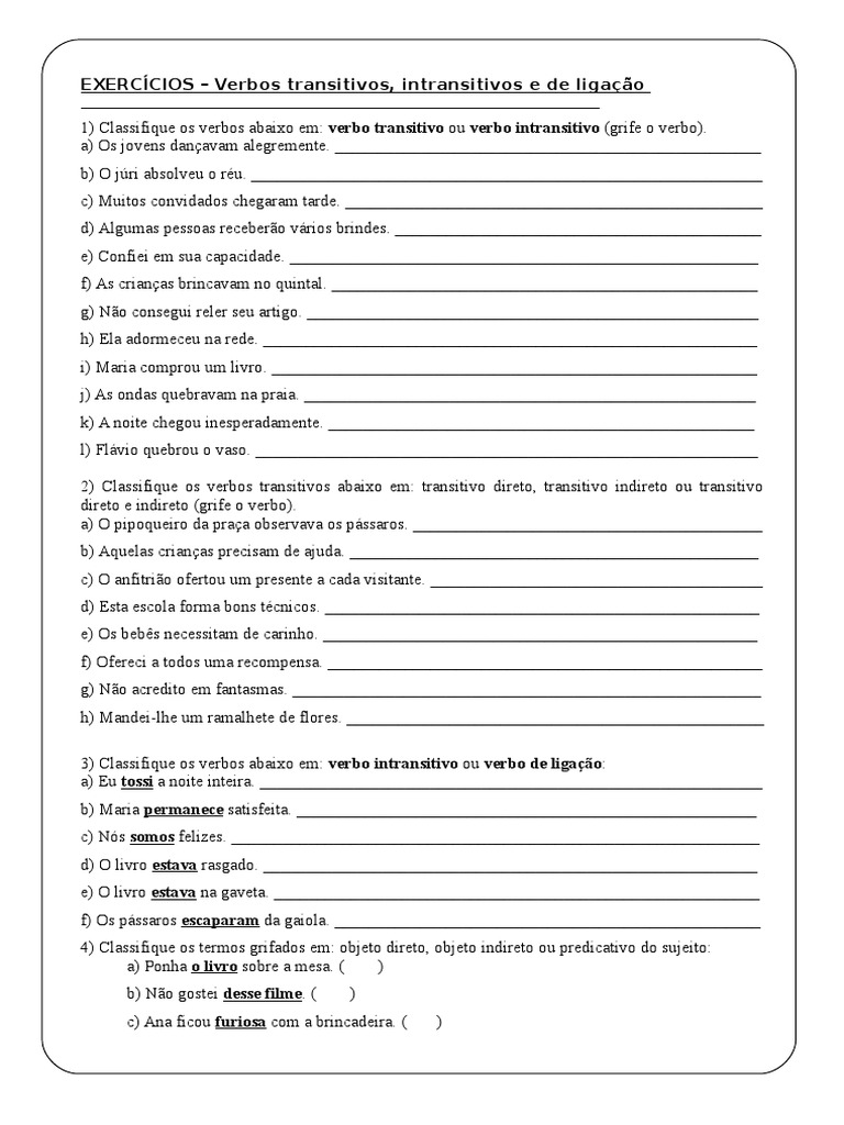 3) Classifique os verbos abaixo em: verbo intransitivo ou verbo de ligação: