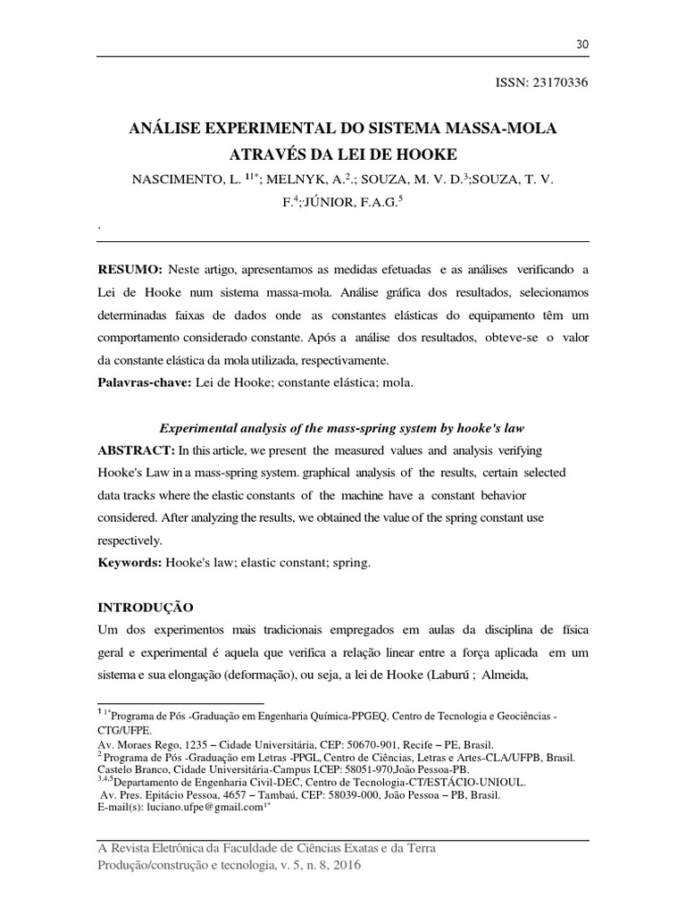 sistema massa-mola para a verificação da Lei de Hooke. De acordo com a Tabela 1 e