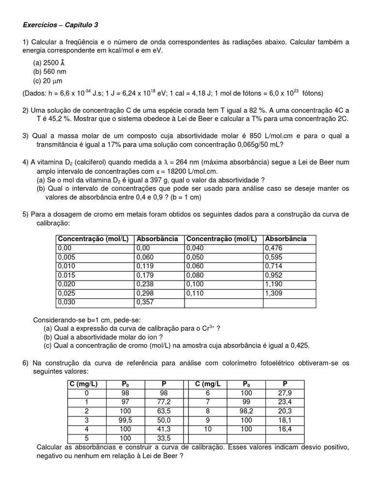 T é 45,2 %. Mostrar que o sistema obedece à Lei de Beer e calcular a T% para uma concentração 2C.