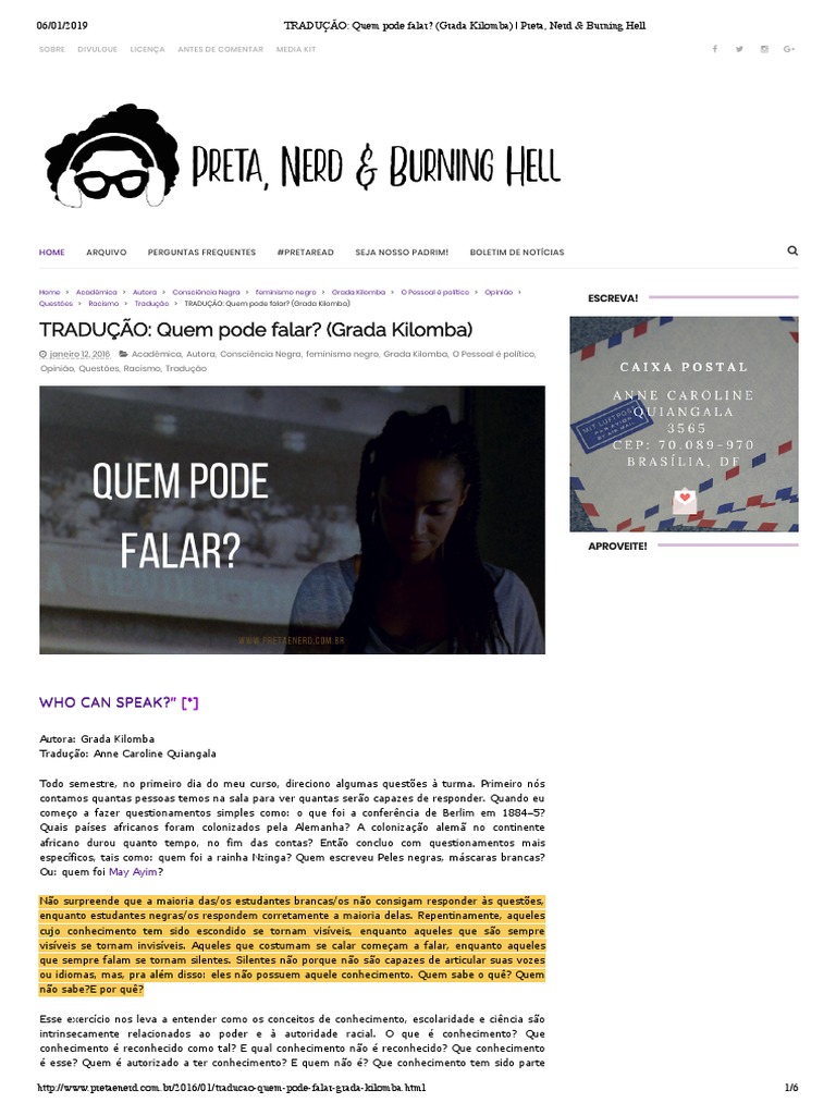 06/01/2019 TRADUÇÃO: Quem pode falar? (Grada Kilomba) | Preta, Nerd & Burning Hell