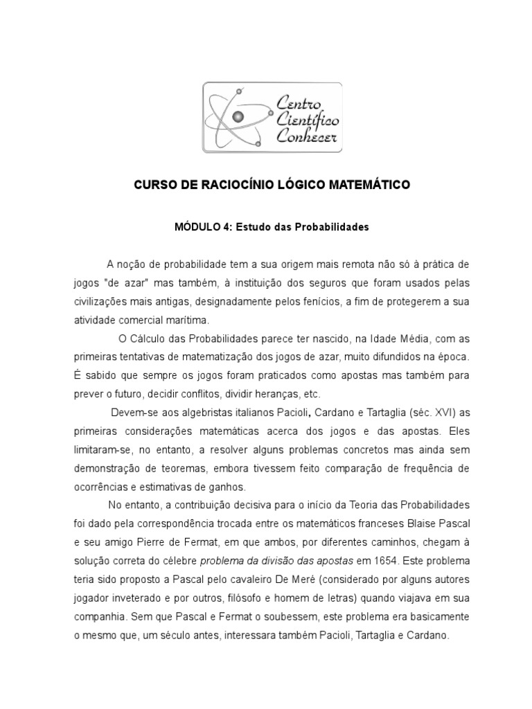 de jogos de azar. Sabe-se que um dos primeiros matemáticos que se ocupou com o