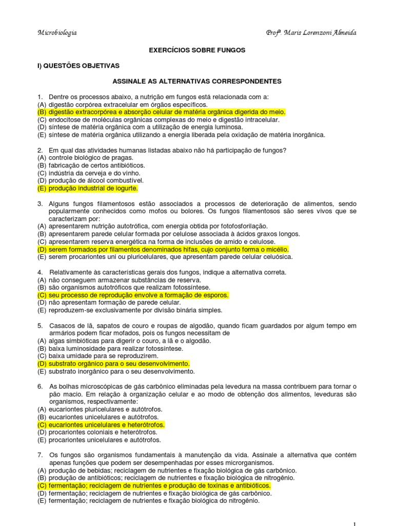 7. Os fungos são organismos fundamentais à manutenção da vida. Assinale a alternativa que contém