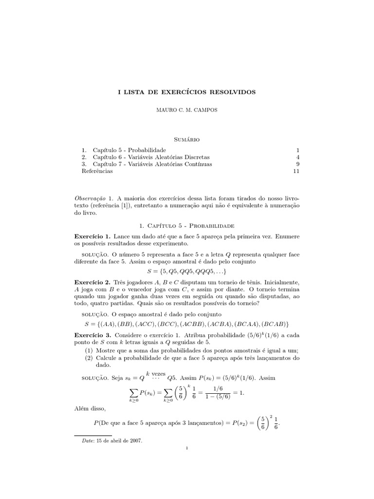 Exercı́cio 3. Considere o exercı́cio 1. Atribua probabilidade (5/6)k (1/6) a cada